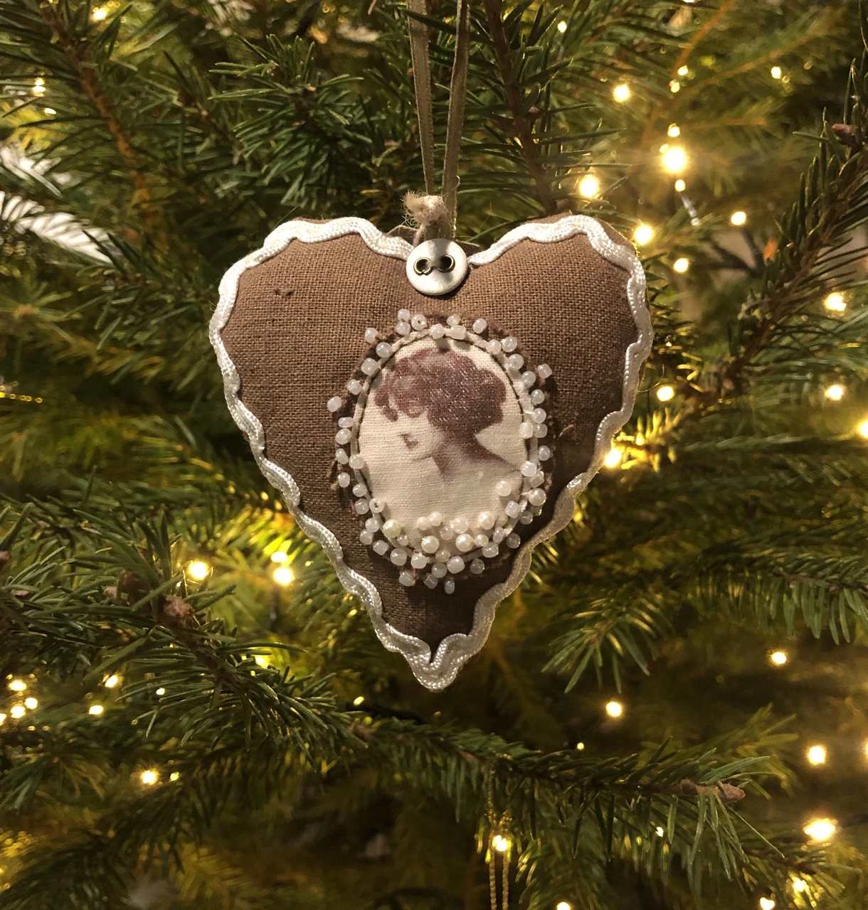 Käsitööna valminud puuvillasest kangast romantiline kuuseehe. Kaunistatud fototrükis vintage pildi, paelte, pesunööbi ja pärlipuruga.