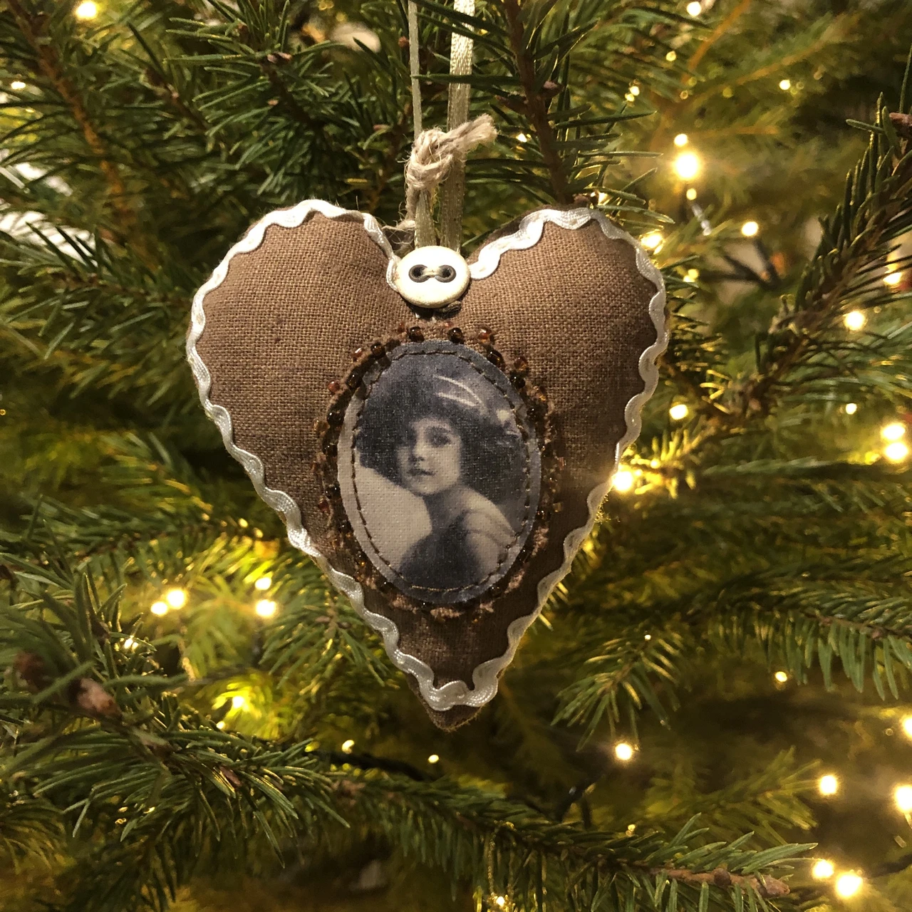 Käsitööna valminud puuvillasest kangast romantiline kuuseehe. Kaunistatud fototrükis vintage pildi, vintage paelte, pesunööbi ja pärlitega.