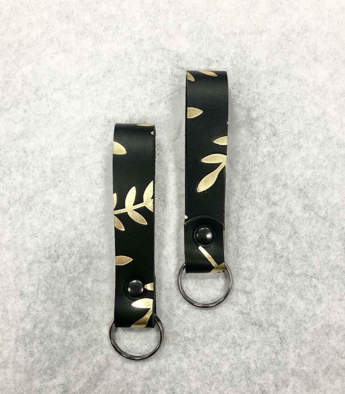 Taimpargitud nahast võtmehoidja, millel on kuldne lehemuster.