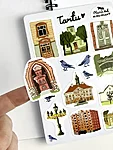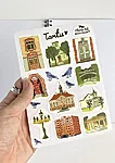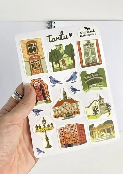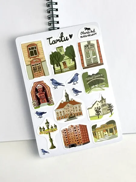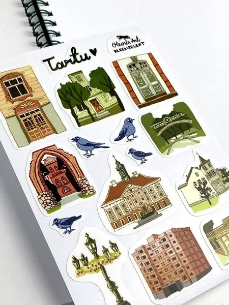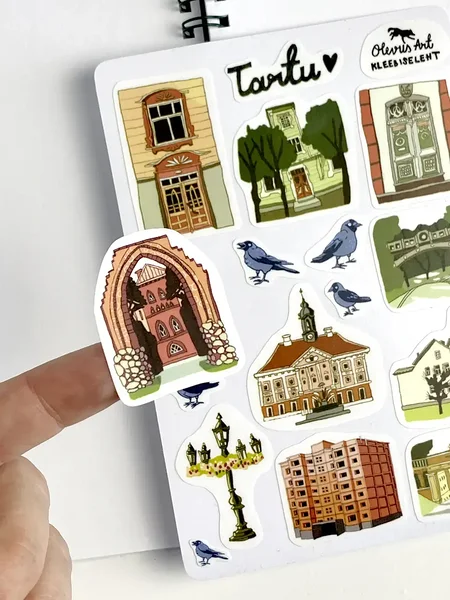 KRISTEL SERGO joonistatud Tartu motiividega kleebiseleht.