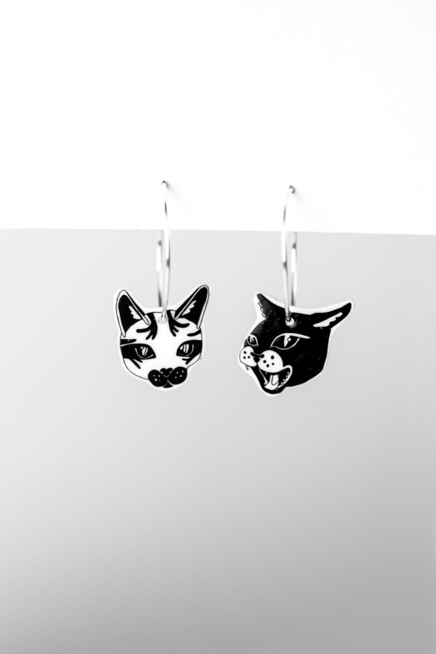joonistusest käsitööna valminud kõrvaehted mjäukassidega.