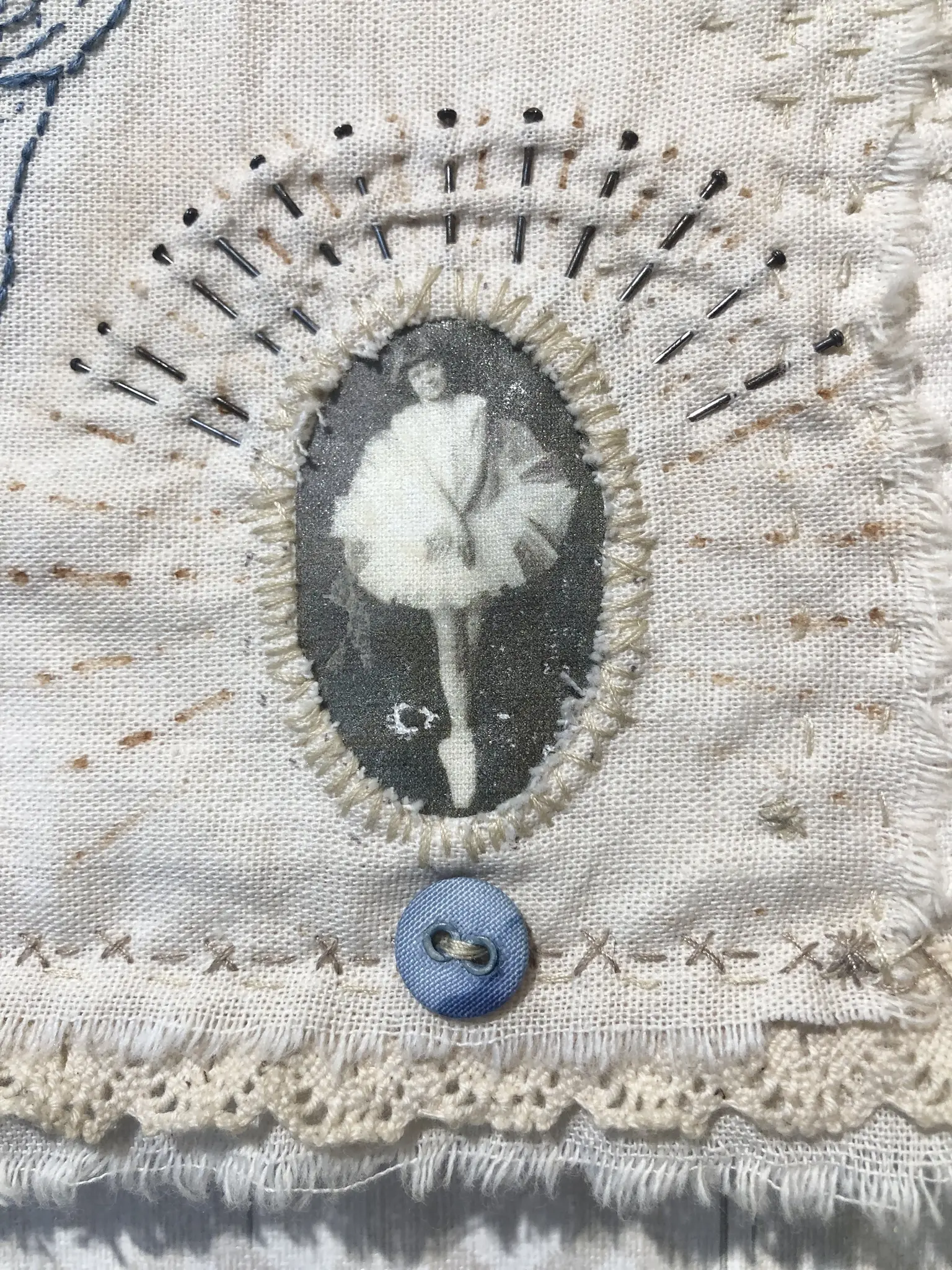 (tikand, fototrükk, taimedega värvitud puuvillane vintage kangas ja detailid)