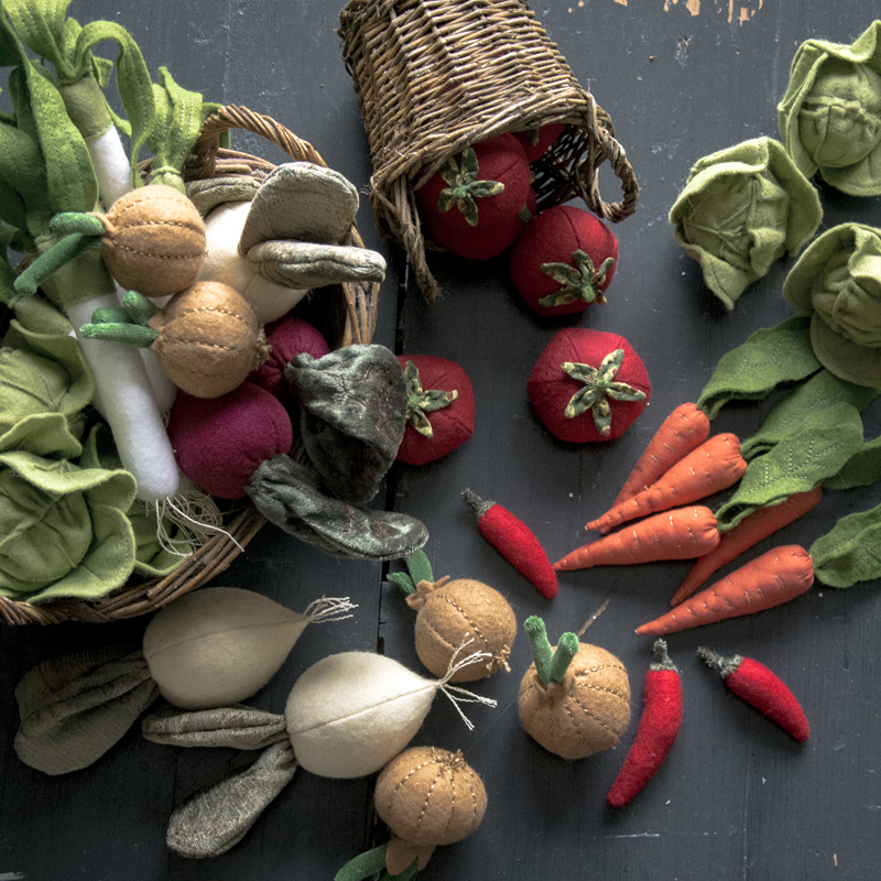 juurviljad ja köögiviljad on pakendatud trükipildiga puuvillasesse kotti.
