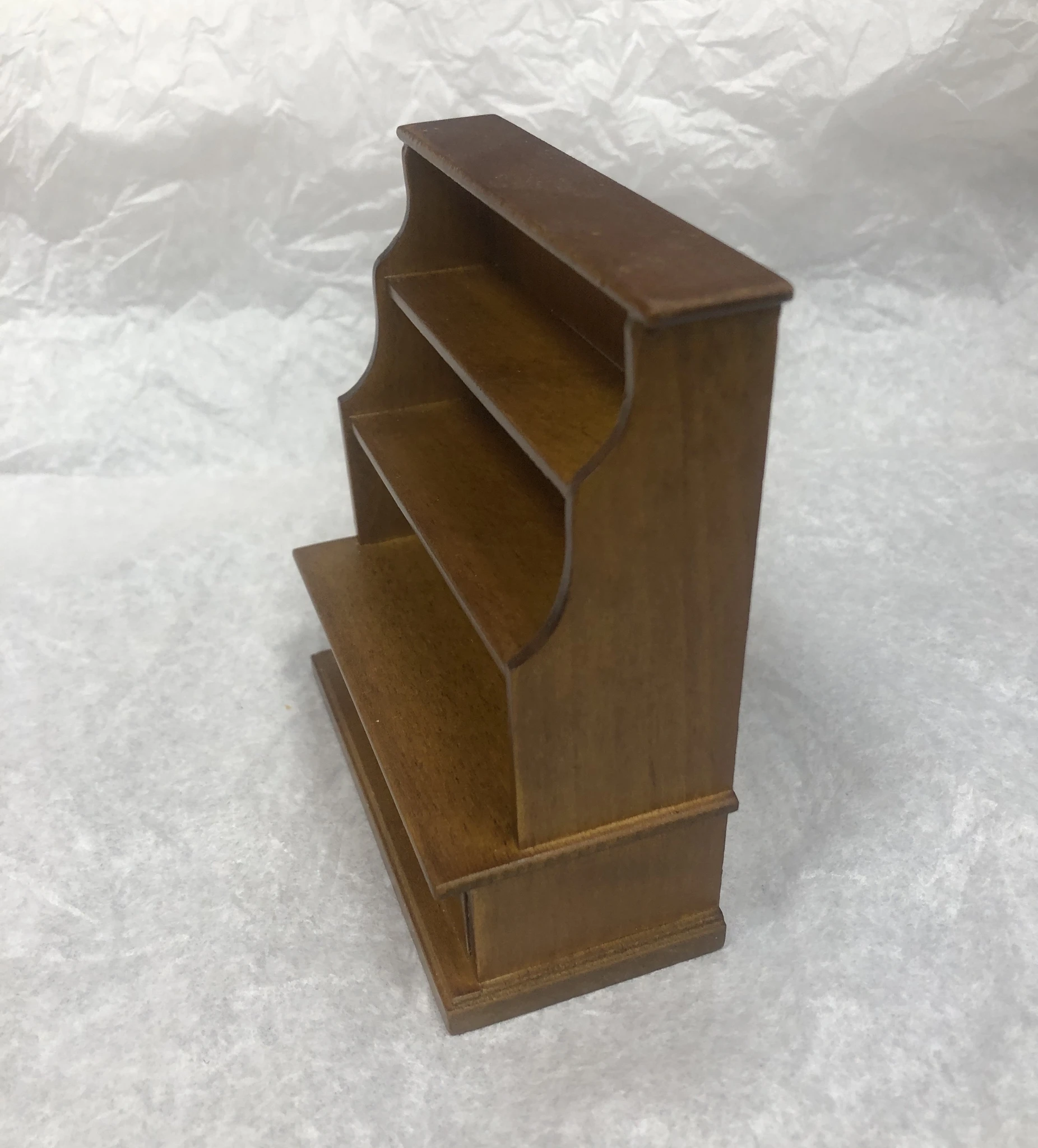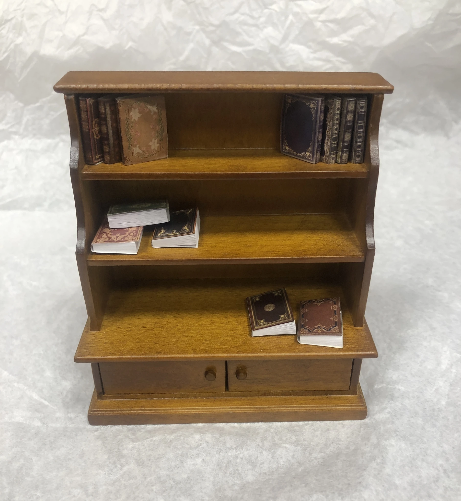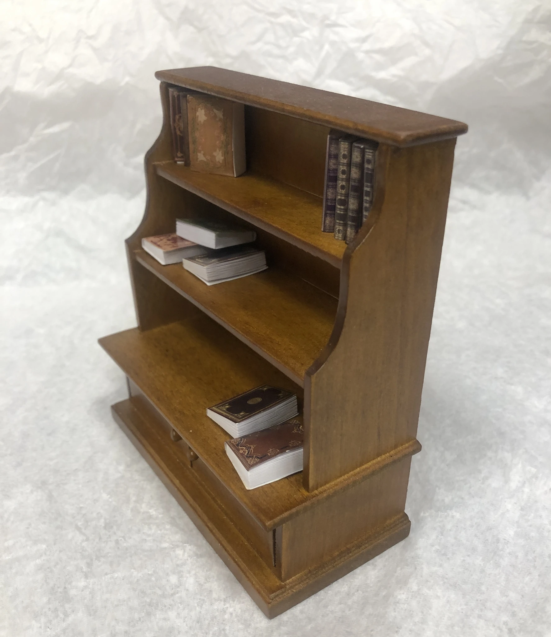 Miniatuurne raamaturiiul sobib 1:12 mõõtkavas nukumajja.