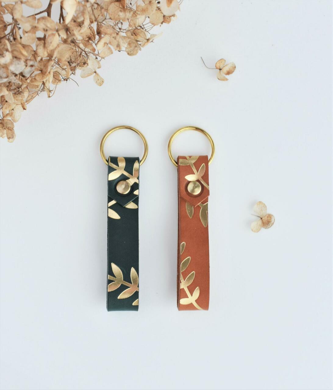 Vegetable tanned leather keychain with a golden leaf pattern. (pattern on keychain is random)