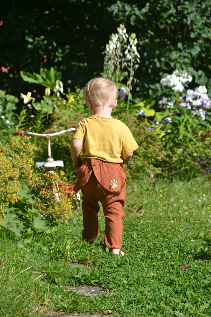 Cotton and linen trousers with braces or dog trousers, the back pocket of which is adorned with a pawprint made of felt.