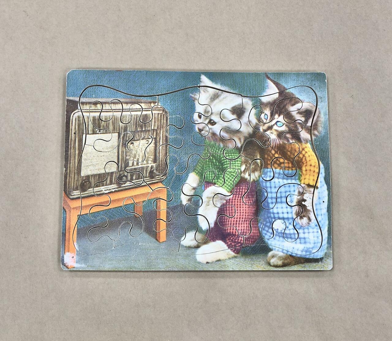 Wooden vintage puzzle with cats. Dimensions 19.5 x 14 cm.