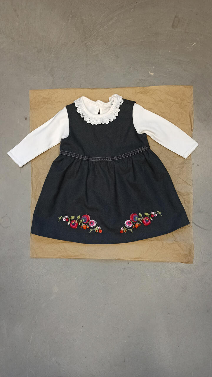 Cute woolen dress with velvet ribbon and flower embroidery for decoration.